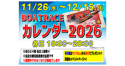 11月26日(水)~ ボートレースカレンダー2026プレゼント!! 11月25日(火)~11月30日(日)【Umeca会員様限定】来場ポイント10倍!詳しくはイベント情報をご覧ください。 12月イベントカレンダーアップしました 最大9場発売中!! Umeca会員募集中!詳しくは「ボートピア梅田とは」をクリック!!