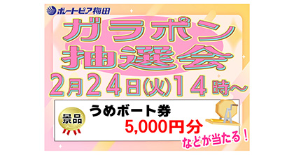 2月24日(火)PGⅠスピードクイーンメモリアルうめぼーガラポン抽選会開催!!詳しくはイベント情報をご覧ください。 2月イベントカレンダーアップしました 最大9場発売中!! Umeca会員募集中!詳しくは「ボートピア梅田とは」をクリック!!