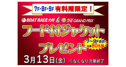 - 3月13日(金)【7・8・9階有料席限定】大村グランプリフード付ジャケットプレゼント!