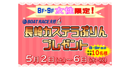 4月29日(水・祝)5203神里琴音選手(福岡支部)トークショー開催!! 5月2日(土)~5月6日(水・祝)【8・9F有料階女性限定】BR大村 長崎カステラぷりんプレゼント! 5月2日(土)~5月6日(水・祝)LINE抽選会 開催! 5月5日(火・祝)~5月10日(日)【Umeca会員様限定】キャッシュレスポイントアップキャンペーン!詳しくはイベント情報をご覧ください。 5月イベントカレンダー(前半)アップしました 最大9場発売中!! Umeca会員募集中!詳しくは「ボートピア梅田とは」をクリック!!