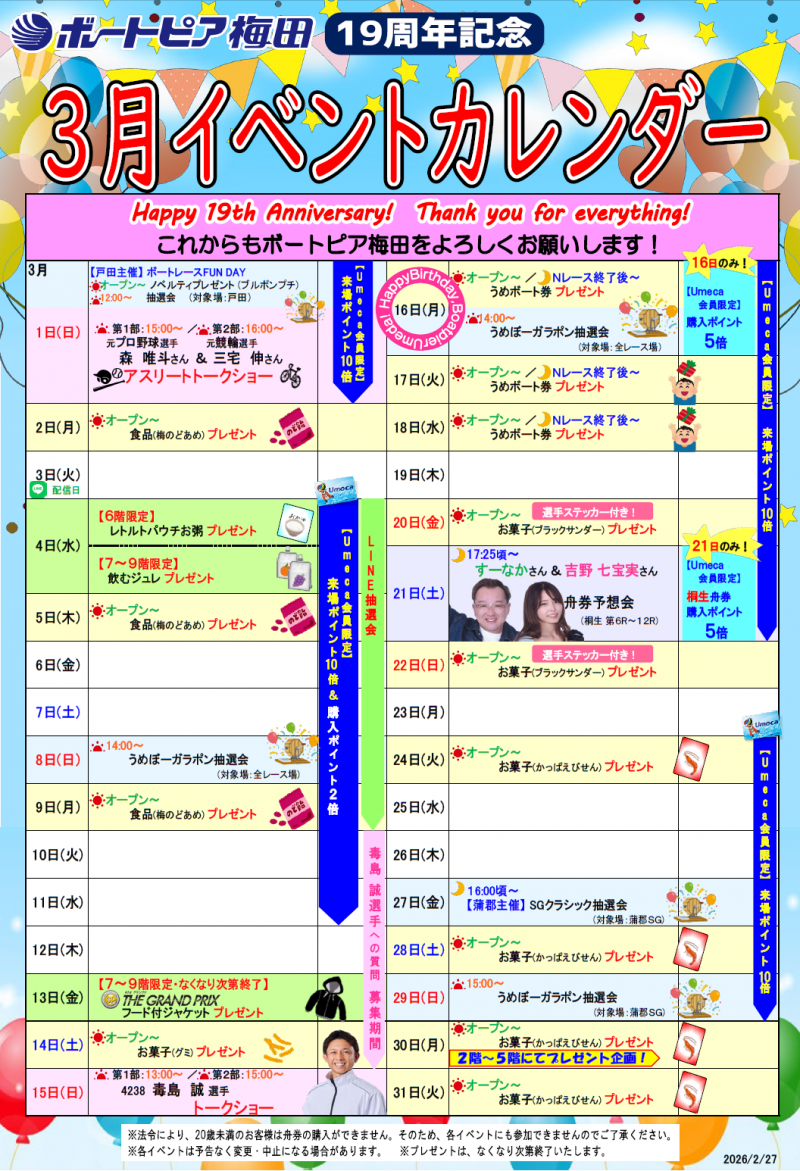 2026/03/01 ボートピア梅田3月イベントカレンダー ボートピア梅田3月のイベントカレンダーです。 皆様のご来場心よりお待ちしております!! ※各イベントは予告なく変更・中止する場合があります。ご了承ください。 ※プレゼントはなくなり次第終了いたします。