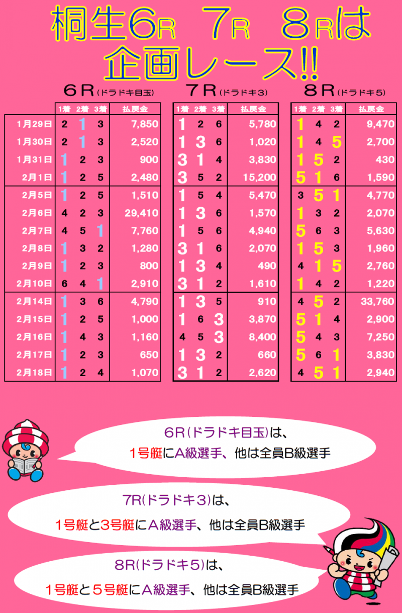 2026/02/20 ボートレース桐生 企画レース紹介!! 企画レースとは、A級選手が好枠に入り、他はほぼB級選手などで構成されているレースのことです。 予想のしやすいレースでよりお客様に楽しんでもらうのが目的です。 ボートレース桐生の企画レースはこんな感じになってます!!