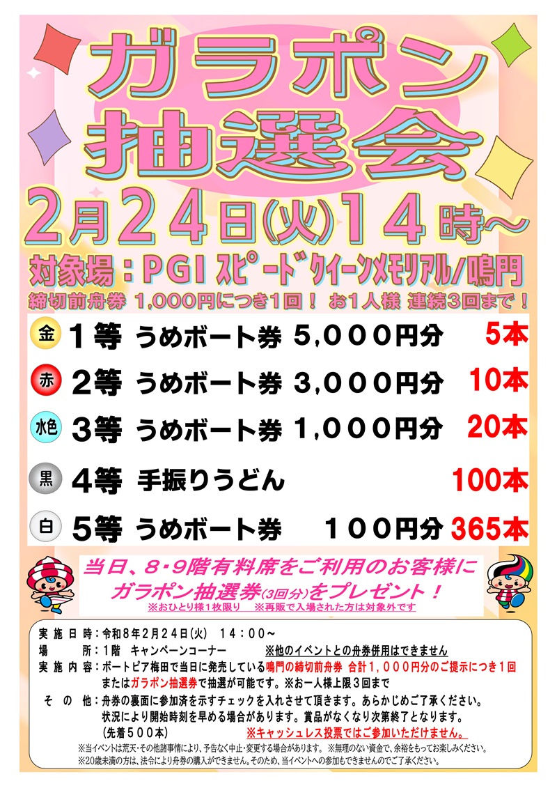 2月24日(火) 鳴門PGIスピードクイーンメモリアル ガラポン抽選会開催!