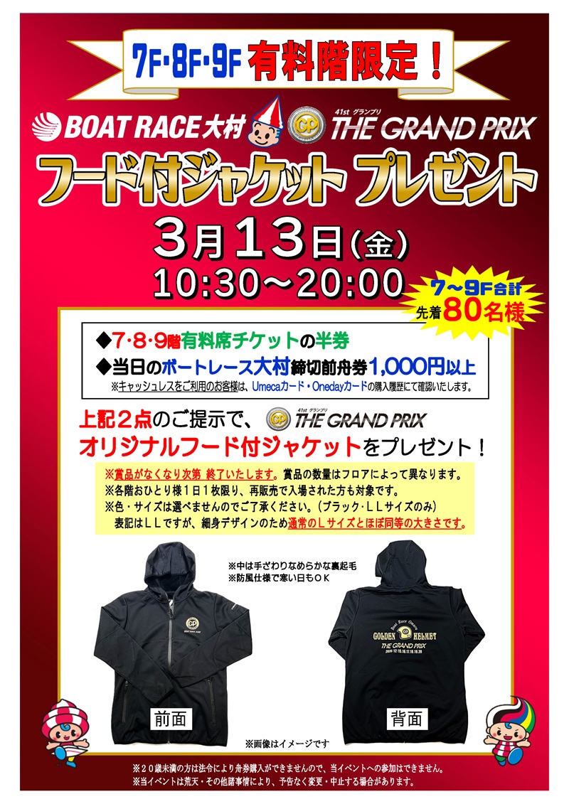 3月13日(金)【7・8・9階有料席限定】大村グランプリフード付ジャケットプレゼント!