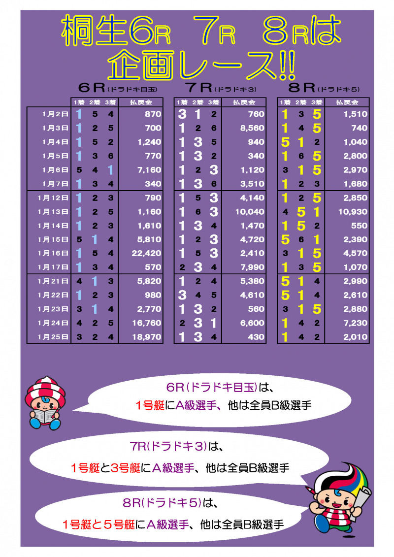 2026/01/28 ボートレース桐生 企画レース紹介!! 企画レースとは、A級選手が好枠に入り、他はほぼB級選手などで構成されているレースのことです。 予想のしやすいレースでよりお客様に楽しんでもらうのが目的です。 ボートレース桐生の企画レースはこんな感じになってます!!