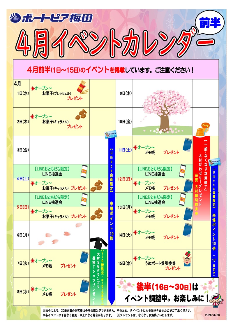 2026/03/29 ボートピア梅田4月(前半)イベントカレンダー ボートピア梅田4月(前半)のイベントカレンダーです。 皆様のご来場心よりお待ちしております!! ※各イベントは予告なく変更・中止する場合があります。ご了承ください。 ※プレゼントはなくなり次第終了いたします。