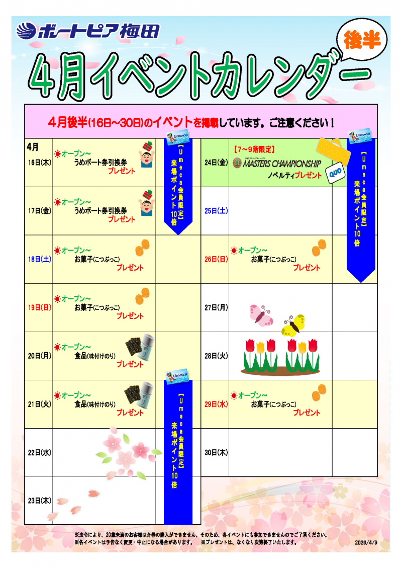 2026/04/09 NEW ボートピア梅田4月(後半)イベントカレンダー ボートピア梅田4月(後半)のイベントカレンダーです。 皆様のご来場心よりお待ちしております!! ※各イベントは予告なく変更・中止する場合があります。ご了承ください。 ※プレゼントはなくなり次第終了いたします。