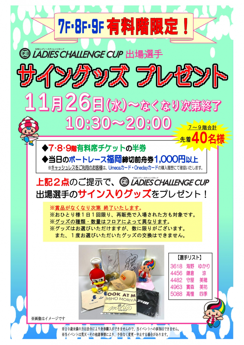 11月26日(水)~【7・8・9階有料席限定】レディースチャレンジカップ出場選手サイン入りグッズプレゼント!